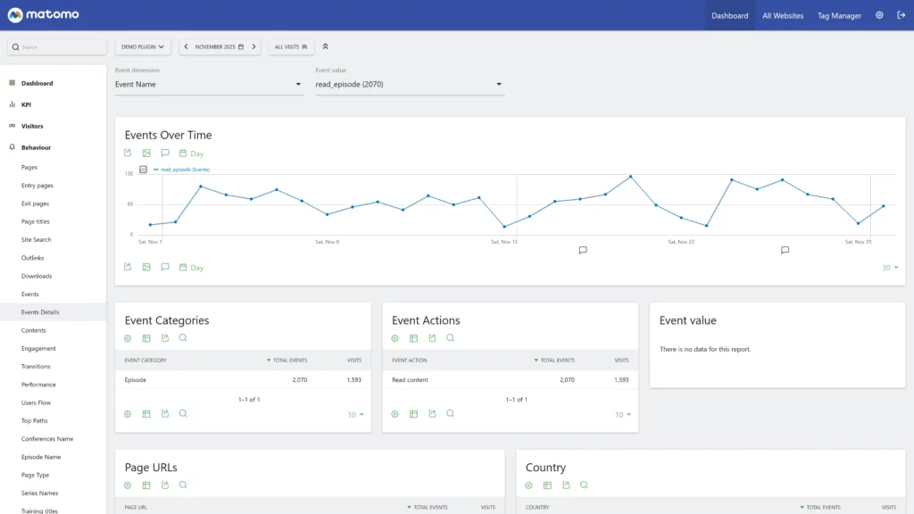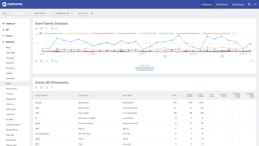 EventEnhanced extends Matomo’s native event tracking with powerful reporting tools. Get deeper insights, save time with unified views, and make better data-driven decisions.